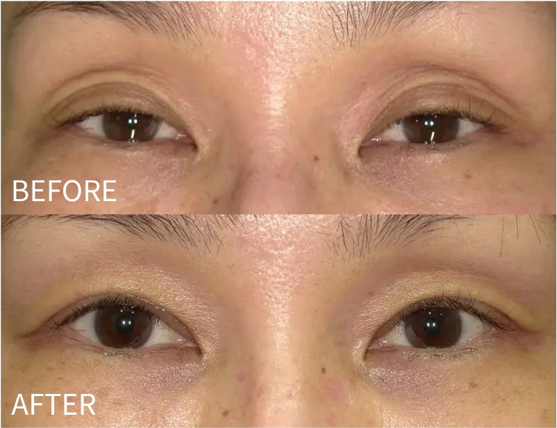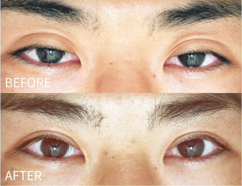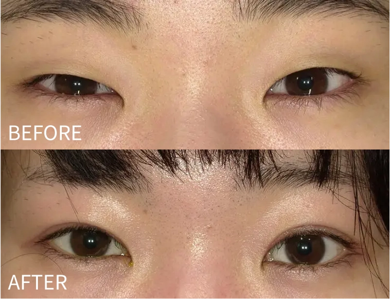 術前におでこボトックスを行い、眉毛下垂を予防して二重幅・皮膚の弛みのズレを防止。その後眼瞼下垂手術を実施。さらに術後に幹細胞移植・エクソソーム点滴を追加するコースです。
