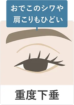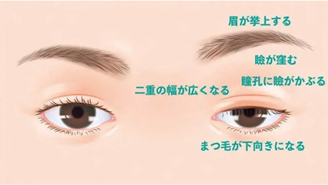 見えにくくなるため、瞼を開けようと額に力が入り、結果額のシワの原因になったり、無理に額の筋肉を使うことで頭痛や肩こり、眼精疲労につながることもあります。