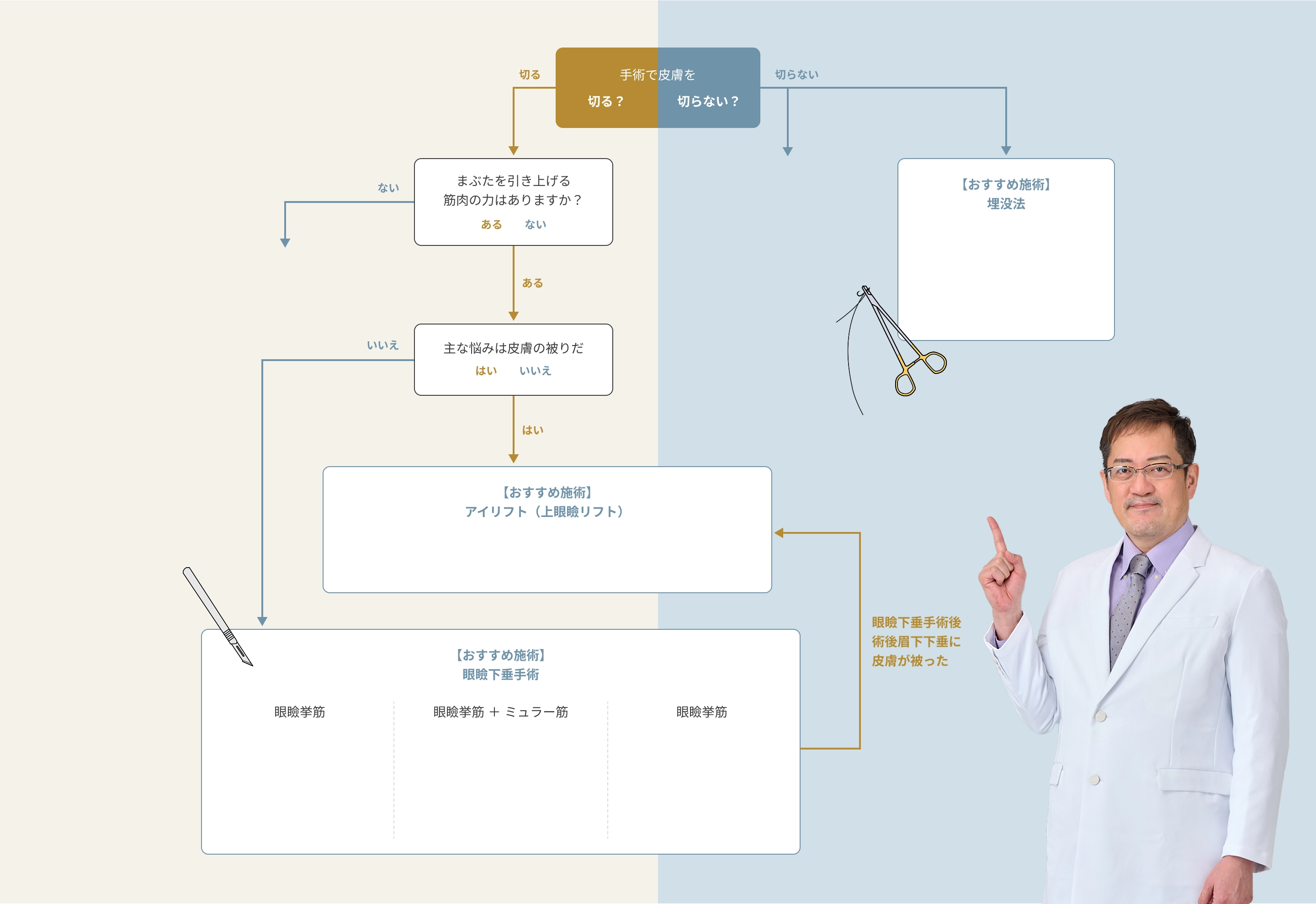 術後のまぶたの引きつり感を少なくする手法を用いて手術を行います。